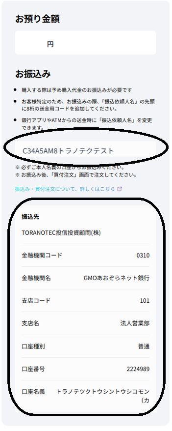 「ファンド購入注文画面」で「振込専用口座」と「送金用コード(8桁)」をご確認ください。